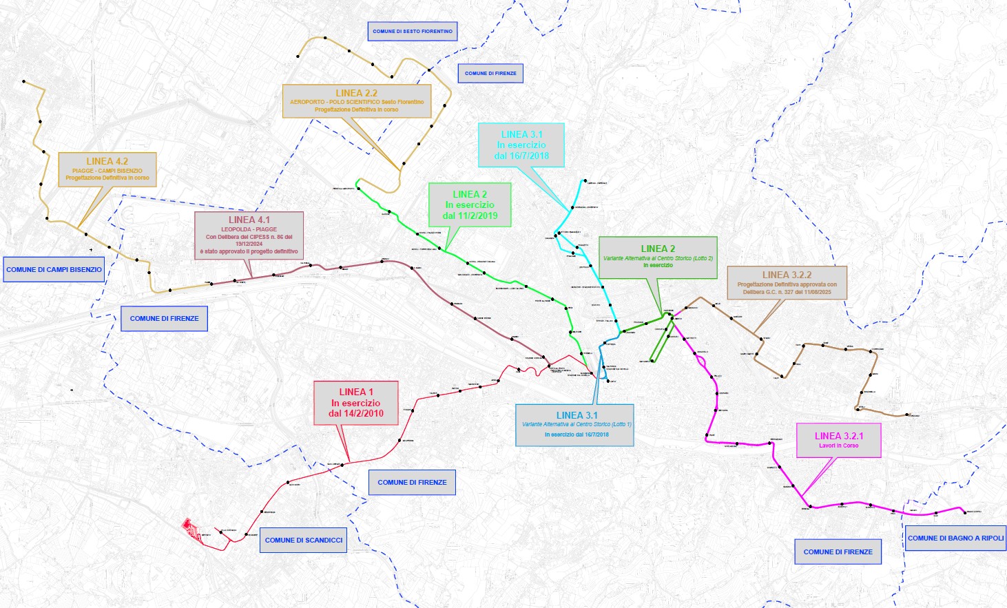 - la Linea 3.2.2 Piazza della Libertà – Rovezzano; il Progetto Definitivo è stato approvato con Deliberazione dell’Amministrazione Comunale n. 327 dell11/08/2025 ed è in corso di definizione l’affidamento al Concessionario Tram di Firenze della Progettazione esecutiva e realizzazione dell’opera, nonché la gestione del servizio.